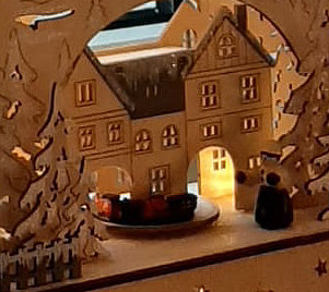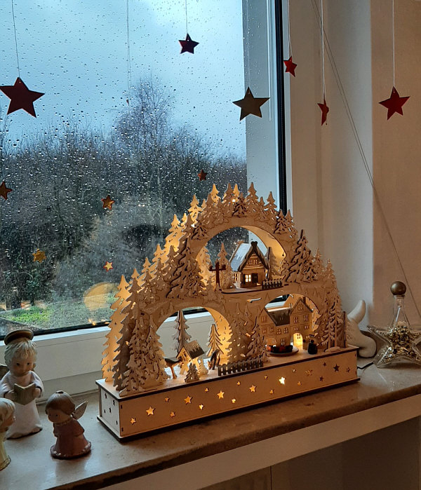 am Fenster gibt es auch Sterne und untendrunter dieser Schwibbogen: