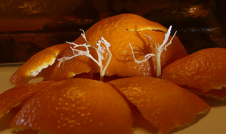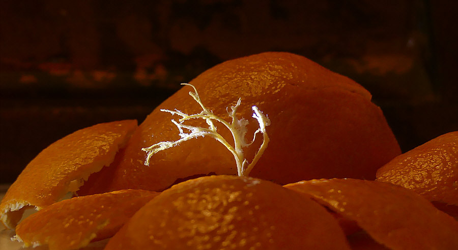 Beate und die Clementine Sie kaufte sie. Sie hat sie geschält. Und gegessen. Dann lagen die Schalen da. Und auch das Mesokarp (das weiße Zeugs in der Clementine). Beate sah, was vor lag. Und hatte eine Idee. ![]() Sie hat das dann mit dem Handy fotografiert und mir geschickt. Da habe ich aber sofort meine Kamera geholt und bin runter und habe damit fotografiert. Dann bin ich noch eine Taschenlampe holen gegangen. Für diese Bilder: ![]() |