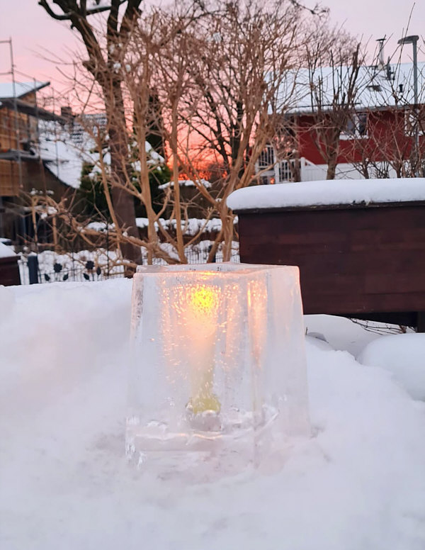 Jetzt ist die Zeit ... in der man Dinge tun kann, die man sonst nicht tun kann. Bei minus 15 Grad klappt das nämlich wunderbar, wenn man Eislaternen basteln will. Christa SF zeigt uns ein solches Kunstwerk der vergänglichen Art, das sie dann auch extra noch mal in der blauen Stunde fotografiert hat: ![]() ![]() ![]() ![]() |