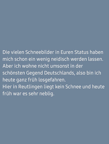 Schnee suchen Das stand ... ![]() ... im Status von Gise. Gesagt getan ... und schon war Gise unterwegs. Und ab dem Landkreis Tübingen war auch nichts mehr vom Nebel zu sehen: ![]() Ganz anders aber ... ![]() ... auf dem Parkplatz, von dem aus es zum Aussichtspunkt ging. 40 km von daheim entfernt. Auf halber Strecke ... ![]() ... zum Aussichtspunkt hatte Gise den Nebel abgehängt. Durch tiefen Schnee stapfen ging es weiter. ![]() ![]() So viel Schnee ! ![]() Blick auf die Burg Hohenzollern. ![]() Wie man sieht, liegt im Tal kein Schnee mehr. ![]() ![]() ![]() ![]() ![]() Ein Schifahrer ... ![]() ... lies sich von einem Schirm ziehen. ![]() ![]() Ganz prächtige Aussichten. Wieder am Parkplatz ... zur Erinnerung ... so sah es am Parkplatz beim Ankommen aus: ![]() Und nun das gleiche Bild, als Gise wieder zurück kam: ![]() Wieder daheim ... ![]() ... lag dort natürlich immer noch kein Schnee, aber der Nebel war weg und auch hier fand die Sonne einen Weg durch die Wolken. Schnee gesucht ... und Schnee gefunden. Und keinen Grund mehr, ein wenig neidisch auf die andere Status zu sein, sondern selbst solche Bilder im Status haben :). |