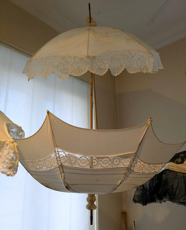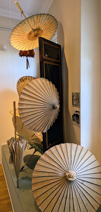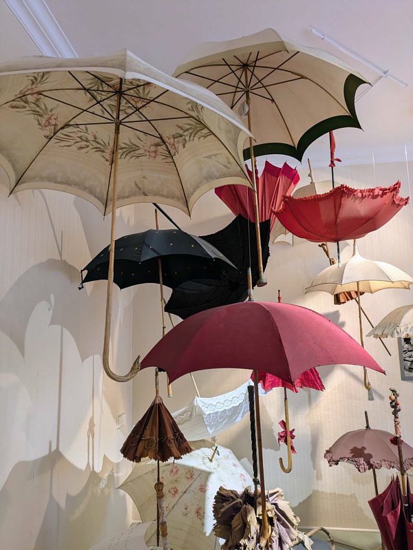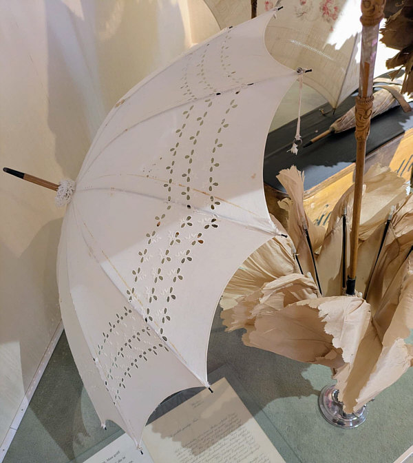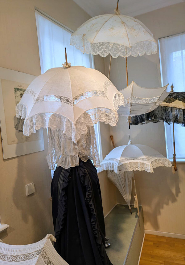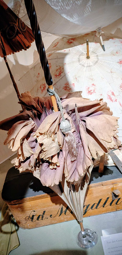 Im Schirmgeschäft Dort, wo Sywe wohnt, gibt es ein kleines, feines Schirmgeschäft. Dort werden ausgefallene, besondere Schirme, Handschuhe und Lederwaren verkauft. Sywe hat sich dort diese Handschuhe gekauft: ![]() Aber nicht nur das ... denn über dem Geschäft hat die Inhaberin ein kleines Schirmmuseum eingerichtet. Dort war Sywe auch und hat uns Bilder mitgebracht: