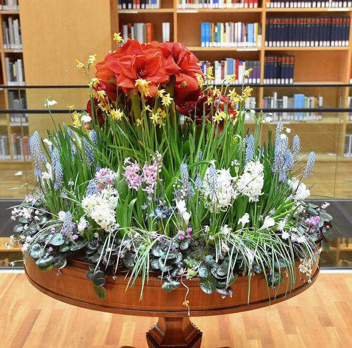 der Stubengarten Sywe war in der Herzogin-Anna-Amalia-Bibliothek in Weimar. Gegründet wurde sie schon 1691. Berühmt ist ihr ovaler und über drei Geschosse reichender Rokokosaal. Seit 1998 gehört sie als Teil des Ensembles "Klassisches Weimar" zum UNESCO-Welterbe. In dieser Bibiliothek findet sich ab jedem Februar auch dieses schönes Stück: ![]() Das ist der "Stubengarten". ![]() Ein Schild gibt uns weitere Informationen: ![]() Und so dürfen die Besucher der Bibliothek in jedem Jahr diesen Blumenschatz begrüßen. Die oberen Bilder sind von diesem Jahr ... 2022 sah der Tisch so aus: ![]() ![]() Ich kann auch noch ein Bild von 2019 zeigen: ![]() Als Zusatzbild zeige ich noch ein Wikipediabild ... das ist der über drei Stockwerke reichende Rokoko-Saal: ![]() |