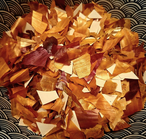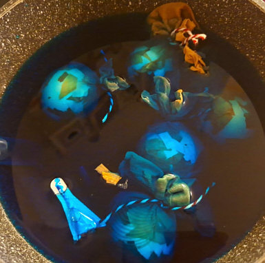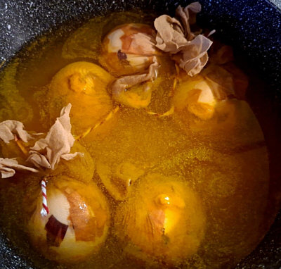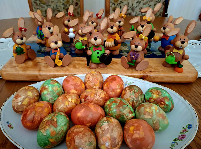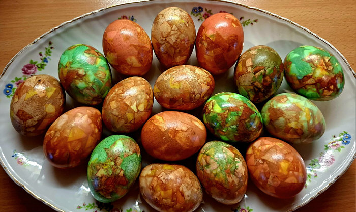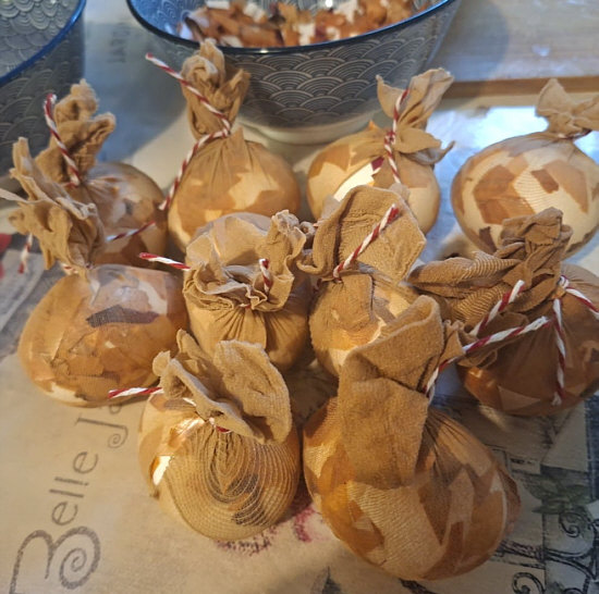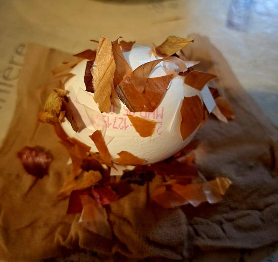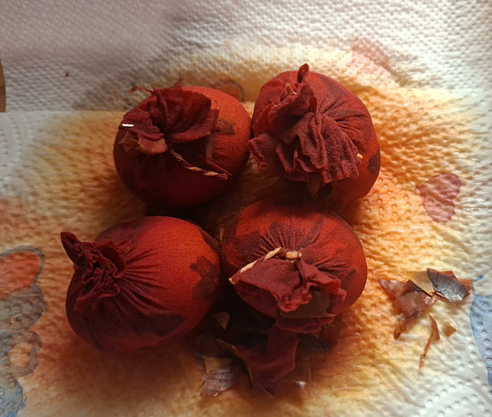 Ostereier färben mit Petra H. Man nehme - Zwiebelschalen, die in kleine Stücke geschnitten wurden Das können normale Zwiebeln sein, aber eine rote Zwiebel dabei ist auch toll. - kleine weiße Papierstücke ![]() - einen Strumpf, der zerschnitten wird - und natürlich Eier ![]() Das rohe Ei wird kurz ins Wasser getaucht und dann in den Schalen gewälzt. Dann in Gaze oder einen zerschnittenen Feinstrumpf gewickelt und zugeknotet. ![]() Ab damit auf den Herd. In kaltem Wasser ansetzen und 5 Minuten kochen. Je nach Farbwunsch kann man noch Ostereierfarbe ins Kochwasser geben.
