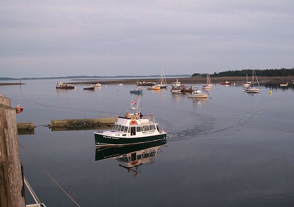 Im Bild sieht man ein Walbeobachtungsboot, das gerade zurück in den Hafen fährt.