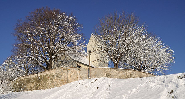 An der Aussicht rechts im Bild sieht man, das die Kirche auf einem Berg steht