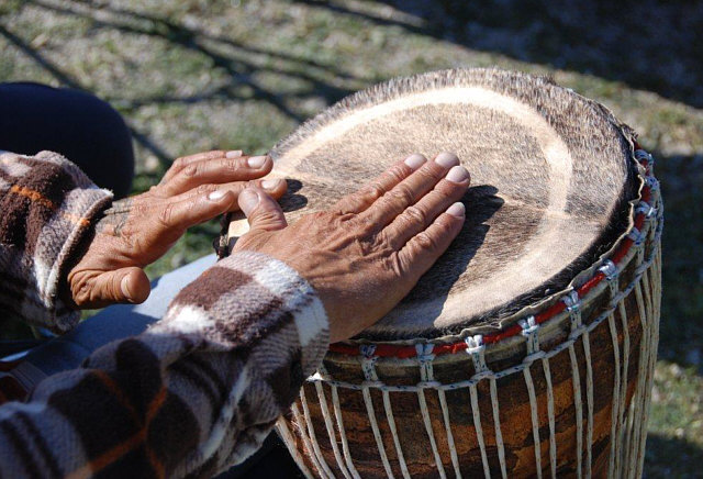 ... seine vom ihm selbst gebaute Djembe ... aus dem unteren Stammende einer Agave gefertigt