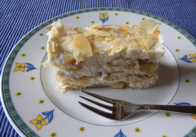 1/3 der Creme darüber verteilen und mit 1/3 der Mandelblätter bestreuen.