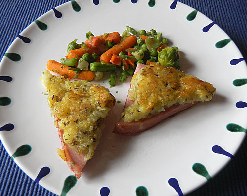 Leberkäse mit Röstikruste, Mischgemüse und grüner Salat