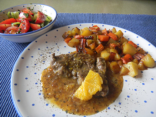 Rindsschnitzel mit Orangen-Pfeffer-Soße, Erdäpfel-Karotten-Gröstel,