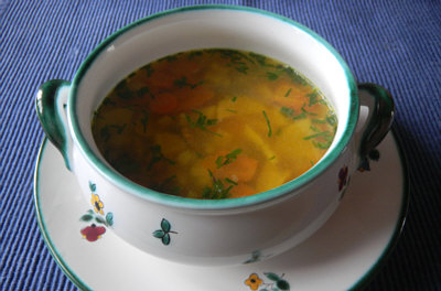 bis das Huhn weich ist, offen, schwach kochen lassen. Suppe abseien.