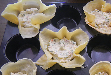 Topfenfüllung in die Palatschinkenkörbchen füllen