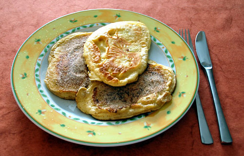 Wenn sie goldgelb sind, hole ich sie heraus und bestreue sie mit Zimtzucker.