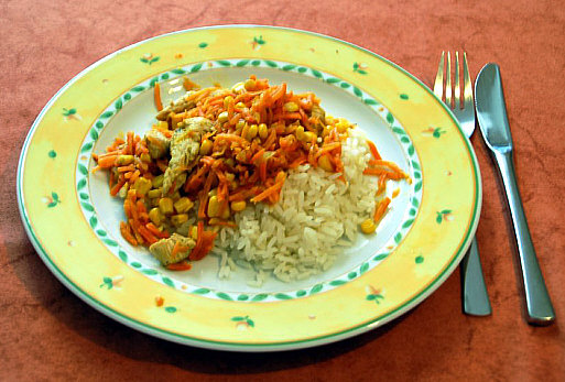 Fischsuppe - Zwiebel-Putenfleisch, Spiralen-Karottenbandnudeln, Salat -