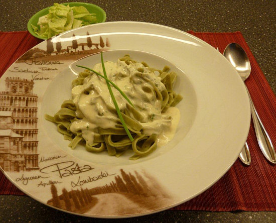 Spinat-Tagliatelle mit Käsesoße und Eisbergsalat