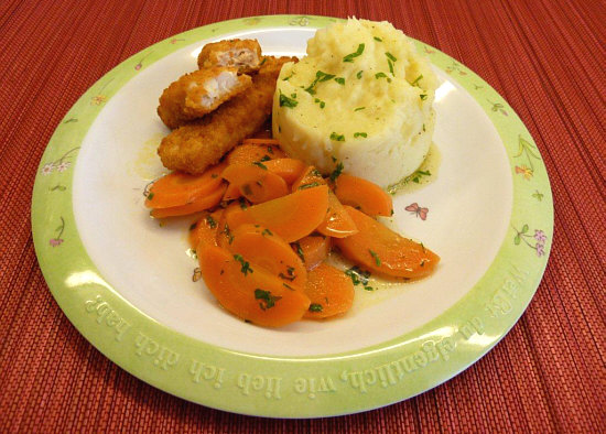 Fisch- und Lachsstäbchen, Kartoffelbrei, Karottengemüse