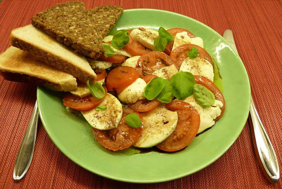 Käsesoße, Eisbergsalat, Schokoladenkuchen mit Himbeeren