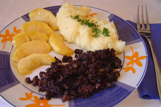 Angerichtet werden dann die Äpfel, die Blutwurst und der Kartoffelbrei.