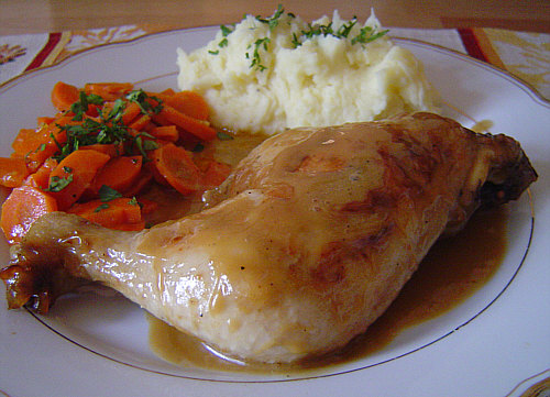 Für zwei Hähnchenkeulen habe ich eine Marinade aus 1 TL Estragon, Salz, Pfeffer,