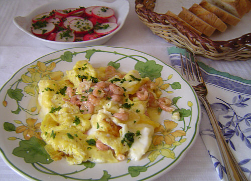 Die Krabben einstreuen, vorsichtig unterheben und das Rührei fertig stocken