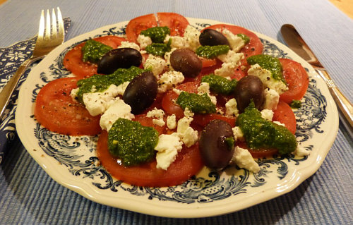 Tomaten in Scheiben, Schafskäse, Kalamataoliven, Feldsalatpesto,