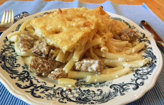 Auf die Hackklöschen kommen nochmal Nudeln und darauf dick der geriebene