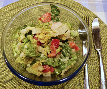 Römersalat, Radieschen, Kirschtomaten, rote Spitzpaprika und zwei