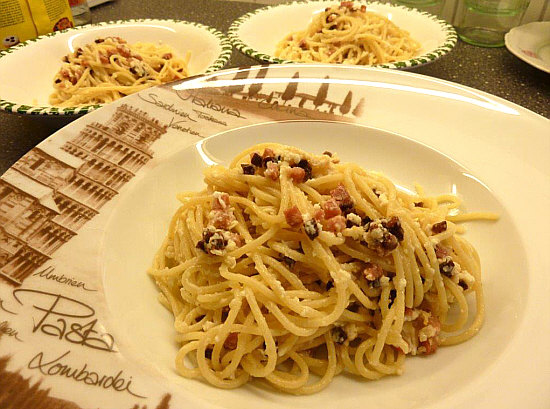 noch leicht feuchten Nudeln sofort zum Speck in die noch warme Pfanne geben.