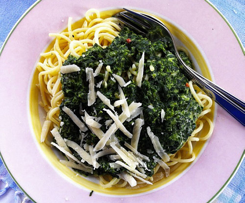 Gut würzig abschmecken und über die Spinat-Spaghetti frisch geriebenen Pecorino