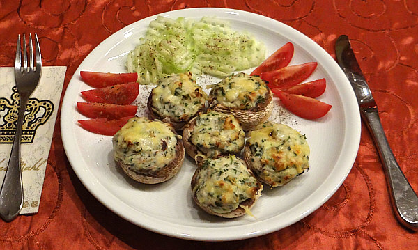 Gefüllte Champignons mit Gurkensalat und frischem Baguette