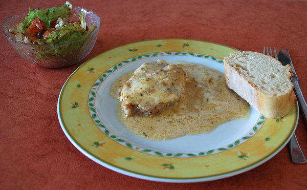 Fischsuppe - Zwiebel-Putenfleisch, Spiralen-Karottenbandnudeln, Salat -