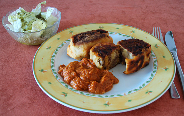Zwiebel-Paprika-Gemüse, Petersilienkartoffeln, Salat - Schoko-Roulade