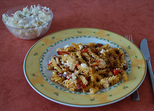 200g Nudeln bißfest kochen, inzwischen 1 rote Zwiebel, eine Knoblauchzehe,