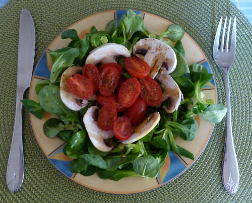 Feldsalat waschen und putzen, frische Champignons in Scheiben schneiden,