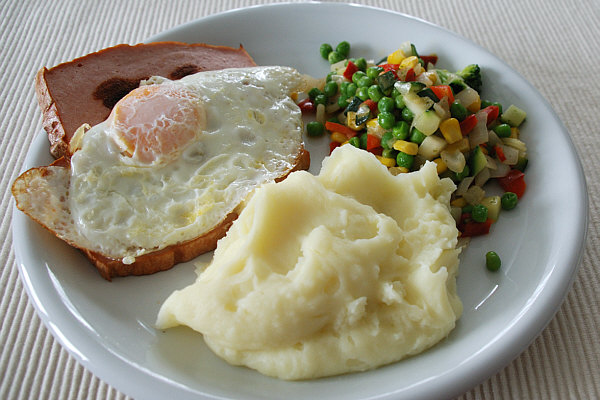 Leberkäse mit Spiegelei, TK-Pfannengemüse, Kartoffelpüree aus der Tüte
