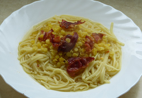Nudeln mit gelben Linsen und Bacon