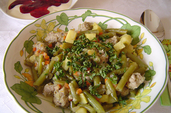 daraus kleine Klößchen geformt und im Bohnentopf gar ziehen lassen.