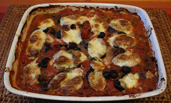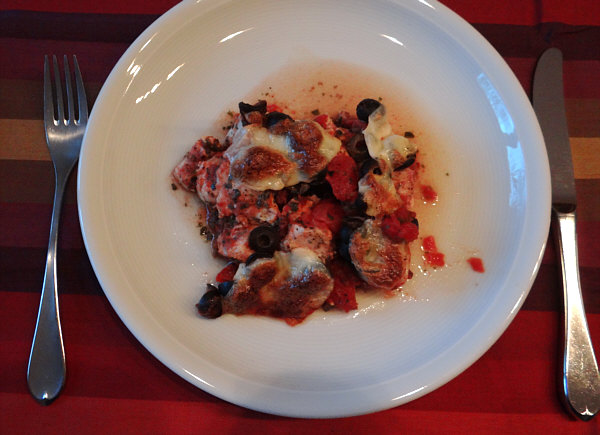 125 g Mozarella in dünne Scheiben schneiden und auf den Zutaten verteilen.