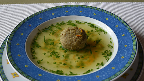 Grießnockerlsuppe - Faschiertes Bällchenragout mit Salat