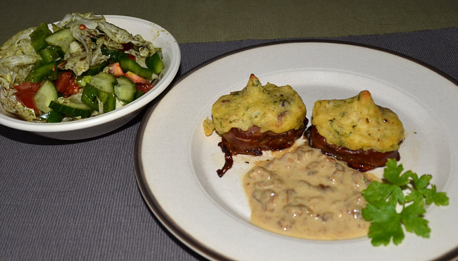 Medaillons auf einem Teller geben und mit jeweils 2 Speckscheiben umwickeln,