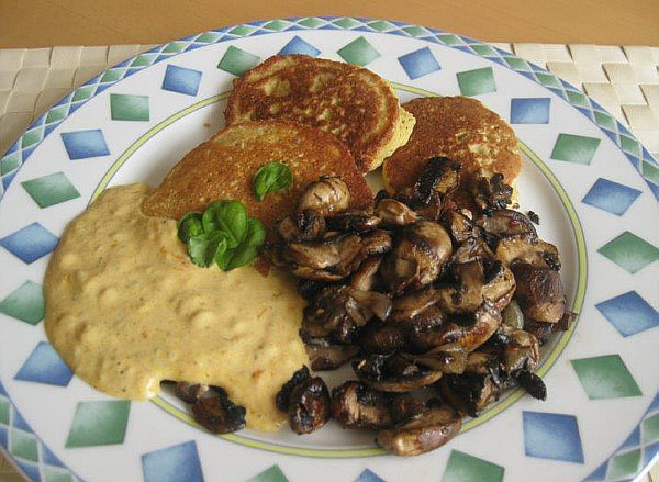 Buchweizenblinis mit Champignons und Bananencurry-Dip