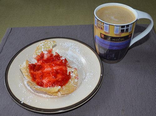 Die ausgekühlten Hippen damit füllen und mit pürierten gezuckerten Erdbeeren