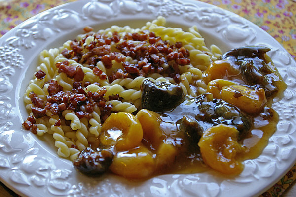 Den Speck auf die fertigen Nudeln geben und Backobst dazu geben.