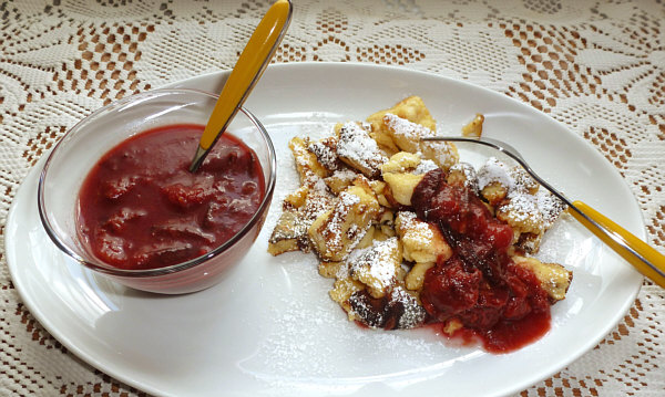 Heißen Kaiserschmarrn mit etwas gekühltem Kompott anrichten,