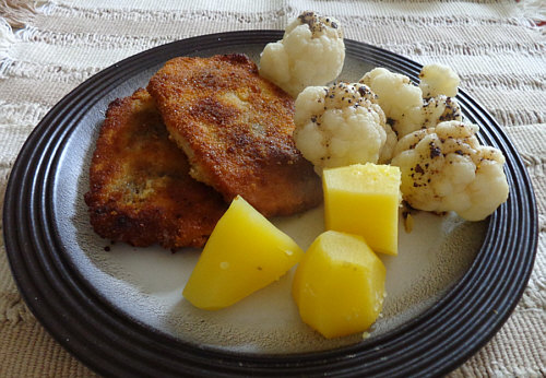 Panierte Minutenschnitzel, Blumenkohl, Salzkartoffeln