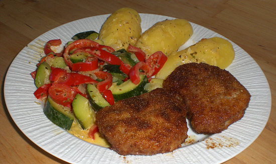 Kalbsschnitzelchen, Zucchini-Paprika-Gemüse, Pellkartoffeln