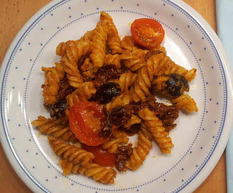 Nudel al dente kochen, Cocktailtomaten halbieren, Oliven halbieren,