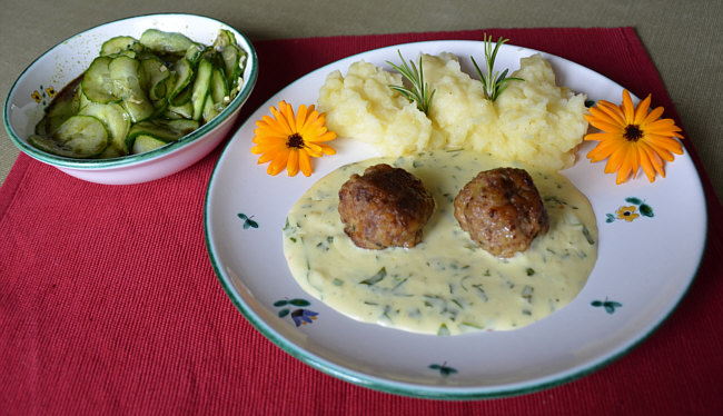 Fleischlaibchen mit Petersiliensauce, Kartoffelschnee, Gurkensalat