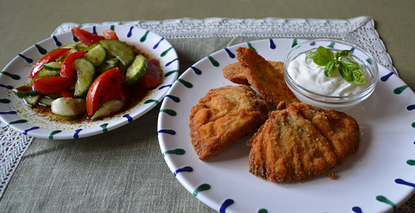 Dazu mache ich Sauerrahm mit zerdrücktem Knoblauch und Salat.