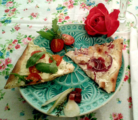geht aber auch mit Yufka-Teig oder natürlich selbst gemachtem Flammkuchenteig)