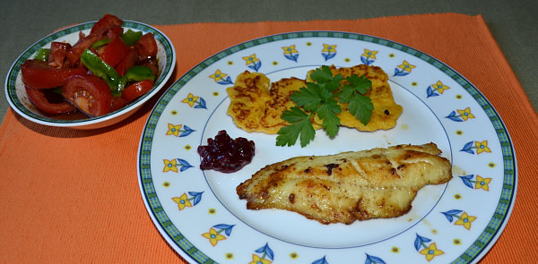 Fischfilet, Safrantaler, Tomatensalat
